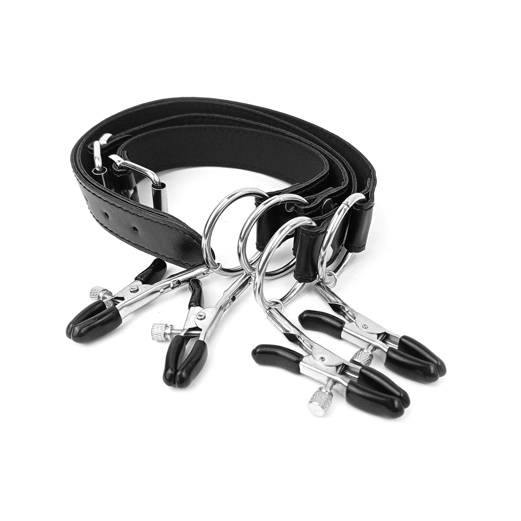 Pezoneras con correas son ideales para juegos eróticos en pareja. Los tornillos delanteros pueden girarse para aumentar y disminuir la presión.